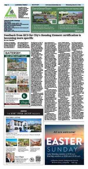 | Published March 27th, 2024 | Feedback from HCD for City's Housing Element certification is becoming more specific | | By Lou Fancher | | | Planning and Building Director Greg Wolff and Housing Consultant Diana Elrod returned to city council March 11 with updated information resulting from a meeting staff held with the State Department of Housing and Community Development on Feb. 27 regarding the Housing Element. Staff last reported to the council Feb. 26 and, having discussed the HE with HCD the following day, they received specific feedback about how Lafayette might best achieve the long-sought HE certification.