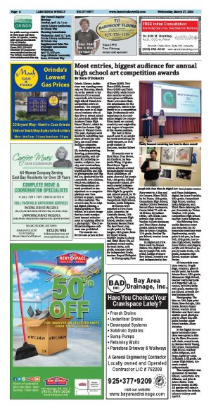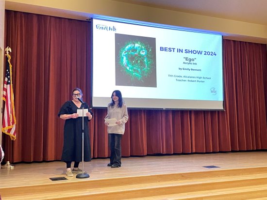 | Published March 27th, 2024 | Most entries, biggest audience for annual high school art competition awards | | By Sora O'Doherty |  | Emily Bennett receiving her Best in Show award | Orinda Library Auditorium was standing room only on Thursday, March 14, as the awards to the winners of the annual Lamorinda Arts Council High School Visual Arts Competition were announced. The competition was open to all high school students who either live or attend school in Lamorinda and/or the Acalanes Union High School District, which includes Las Lomas High School in Walnut Creek. This year, students were limited to submitting one piece of work per category, but could enter multiple categories.