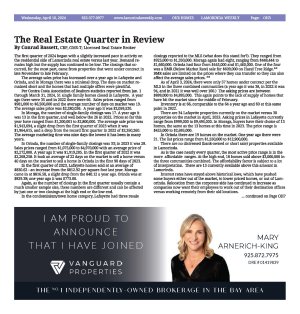 Per Contra Costa Association of Realtors statistics reported from Jan. 1 through March 31, 2024, 51 single family homes closed in Lafayette. A year ago there were 35 and in 2022 there were 66. Sales prices ranged from $981,000 to $6,500,000 and the average number of days on market was 19. The average sales price was $2,280,036. A year ago it was $2,059,520.