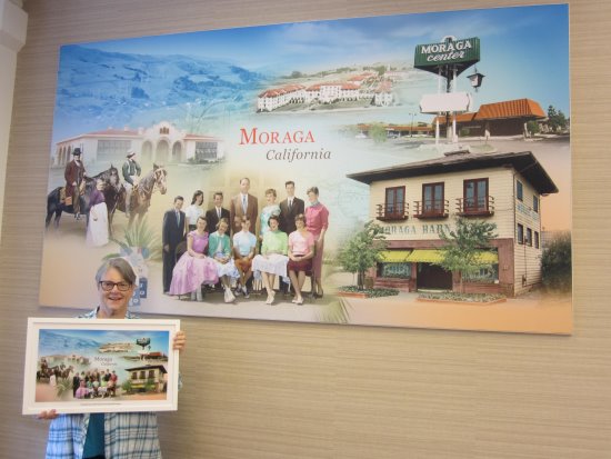 Moraga's 8.7 foot wide by 4.8 foot high mural contains photos of Saint Mary's College, the iconic Moraga Center sign, the Carroll family and their horses c.1920, a sweeping view of the Moraga Valley, and Willow Spring School's eighth grade graduating class of 1957 (11 students).