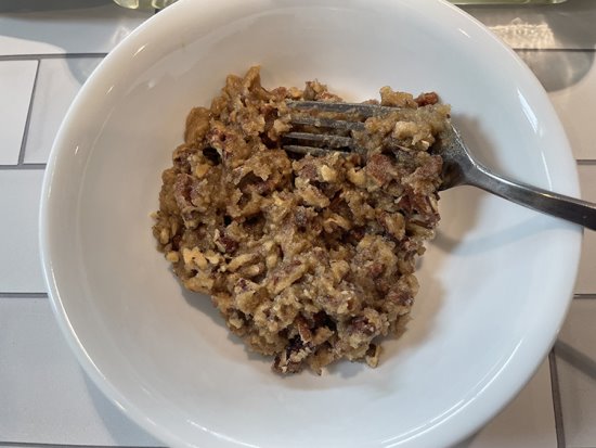 With a fork or wooden spoon, blend softened butter and brown sugar until blended. Stir in vanilla, maple syrup, and toasted chopped nuts to combine well.