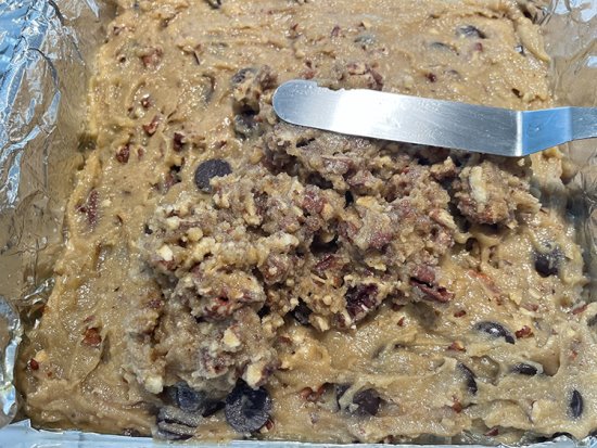 Using an offset spatula, evenly spread a thin layer of this mixture over the blondie batter.