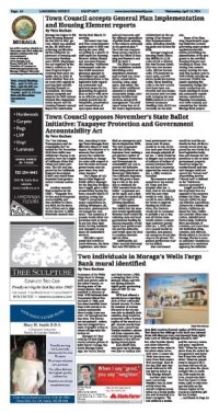 Page 4 - 5 Town Council accepts General Plan Implementation and Housing Element reportsTown Council opposes November's State Ballot Initiative: Taxpayer Protection and Government Accountability ActTwo individuals in Moraga's Wells Fargo Bank mural identifiedMoraga's Business and Nonprofit of the Year
