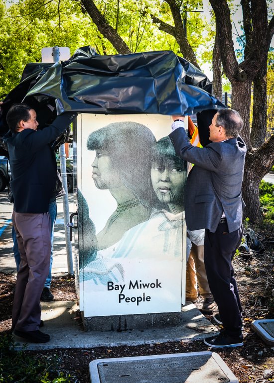 | Published April 24th, 2024 | Lafayette unveils two projects honoring the city's indigenous roots | | By Sora O'Doherty |  | Lafayette Vice Mayor Wei-Tai Kwok and John McCormick. chair of the city's Land Acknowledgement Task Force, unveiled a utility box wrap honoring indigenous people. Photos Sora O'Doherty | An acknowledgment that Lafayette occupies unceded indigenous land is featured on a utility box wrap, alongside artwork portraying women of the Saklan tribe. The new utility box wrap was unveiled on April 8 on the corner of Mt. Diablo Blvd. and Lafayette Circle, adjacent to the Bank of the West building.