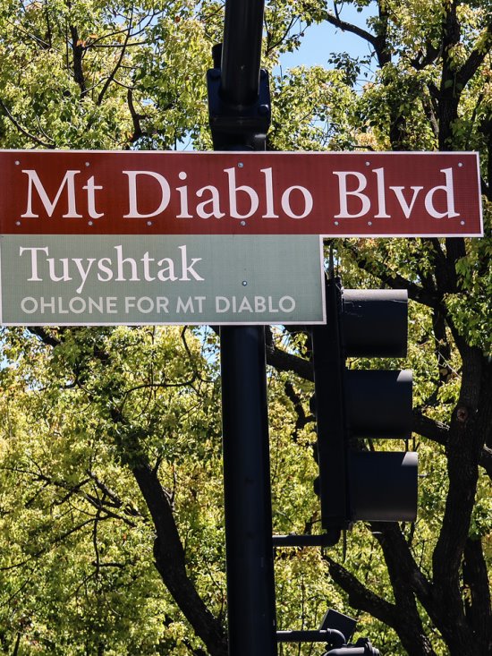 In addition to the utility box wrap, the city also unveiled a new street sign that incorporates both the current name of the street, Mt. Diablo Blvd., and the name of the mountain used by the Ohlone, "Tuyshtak," which means dawn of time.