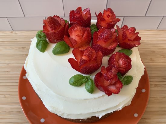 Place one layer on your cake platter and spread half of the frosting on top. Place the second cake layer on top of the first and spread the remaining frosting to cover the top of the cake. Arrange strawberry roses on top of the cake and add a few leaves here and there. If your strawberry leaves are in decent shape, use those, otherwise you can substitute with basil or mint leaves.