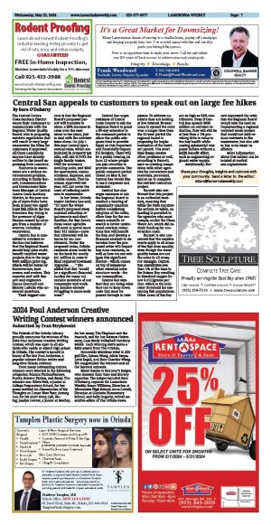 | Published May 22nd, 2024 | Central San appeals to customers to speak out on large fee hikes | | By Sora O'Doherty | | | The Central Contra Costa Sanitary District wants their customers to communicate with the Regional Water Quality Board, who is proposing nutrient regulations that will result in very large wastewater fee hikes for customers if approved. All three Lamorinda mayors have already written to the board expressing their concerns.