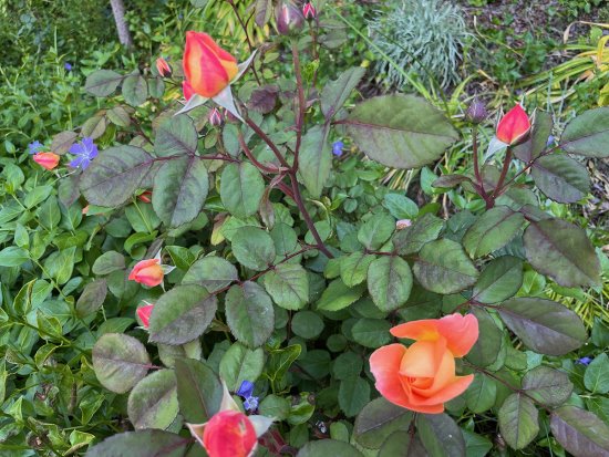 Lady Emma Hamilton roses create excitement in the border with their tight, bright orange buds Photos Cynthia Brian |