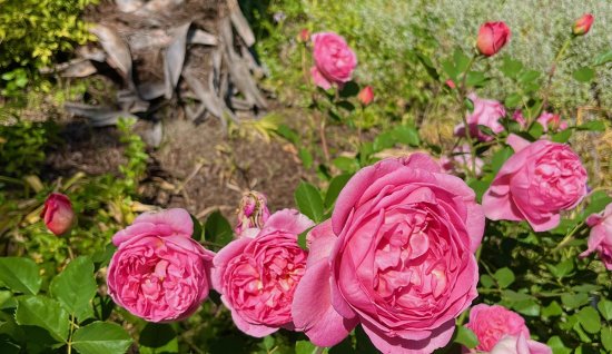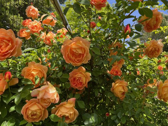 Roses. Oh, the roses. Check out the photos of two of my glorious, rambunctious rose climbers in this article, Lady of Shalott and Gertrude Jekyll, both English roses from David Austin. Not only have they climbed above the weeds, but they are adorning limbs on my magnolia tree and covering my fence. Lady of Shalott is a repeat-flowering, hardy rose, part shrub, part climber, that is disease-resistant with rich orange-red buds that open to form bounteous chalice-shaped blooms of salmon, pink, and peach with 60-plus petals. The voluptuous fragrance has hints of clove, spice, and apple. The Gertrude Jekyll rose climber, named after the famous gardener, displays about 80 petals of gorgeous rosette-shaped blooms in splendid shades of pink with the most strongly scent rose fragrance. Flowers flow freely branching all along the climbing stems. Because our climate is warmer than what it prefers, it repeats less often.
