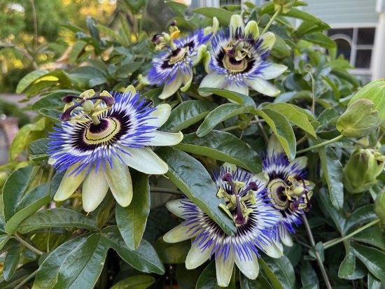 archive/issue1805/Digging-Deep-with-Goddess-Gardener-Cynthia-Brian-Social-Climbers.html ), I mentioned passionflowers and climbing roses. In this column, you get to see photos, too. My passionflowers are especially robust and decorative this year. There are 500 species or more of this unique, flamboyant, and fragrant pollinator magnet. Passionflowers prefer moist soil with good drainage and full sun exposure. They thrive in zones nine to 11, where temperatures range between 60-90 degrees. Remember that it is a vine requiring solid support structures for climbing. Some, but not all varieties produce edible passion fruit. Native tribes foraged passionflowers for a multitude of uses including medicinal applications.