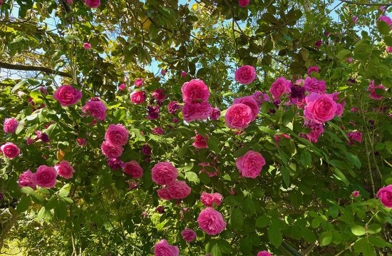 Caring for roses requires time and patience, but roses are not fussy. Growers recommend planting roses in areas where a minimum of four hours of sunlight daily will shine on them. Generally, the more sun the better unless the temperatures soar, in which case roses benefit from afternoon shade. Roses need air circulation and space for their roots to grow without competition from neighboring trees, bushes, or other plants. I do my heavy pruning in January and February. This is also the best time to plant bare-root roses. In March, when the leaves are unfurling, I sprinkle alfalfa pellets around each plant as an organic, slow-release nutrient that breaks down with the rain or irrigation. At this time, apply a rose spray as a preventative measure to control blackspot, powdery mildew, and rust, following the directions. In spring and mid-summer, feed your roses with an organic fertilizer. Mulch with wood chips, shredded bark, redwood, or pine needles to improve the appearance of the beds. Mulch aids in retaining moisture, suppressing weeds, and stabilizing the plant. For pest control, let nature do its magic with the birds and bugs battling the bad actors. Deadheading is a must from May through December to maintain continuous flowering. This is the most arduous task because if deadheading is not maintained, rosehips form, and the flowering falters. Appropriate watering is essential. The soil needs to be moist but not soggy. Water deeply in the morning or evenings. Attend to container moisture requirements as pots dry out quickly in hot weather. From December to January, I allow the rosehips to form. Birds enjoy a winter feast. The cycle repeats when the heavy pruning begins.