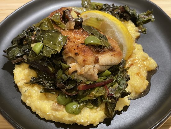 To serve, spoon the greens over a bed of the polenta and place two chicken thighs on top. Serve with a lemon wedge on the side.