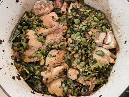 | Published May 22nd, 2024 | One dish chicken with herbs, greens, and olives | | By Susie Iventosch |  | Chicken on polenta Photos Susie Iventosch | With home gardens starting to produce vegetables and herbs, this chicken and veggie recipe is a perfect choice for a garden-fresh dinner. Made with scallions, Swiss chard, collard greens, cilantro, parsley, and olives, it is so delicious and easy to make in just one pot or pan. You can prepare most of the ingredients ahead of time, so it's easy to assemble once you're ready to roll for dinner.