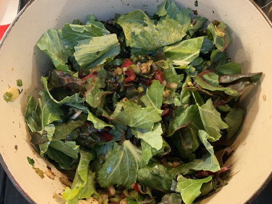 Reduce heat to medium-low, and slowly add the chopped greens a handful at a time, until all of the greens fit into the pan, tossing them with the onions and olives in the bottom of the pan as you go. Don't over cook the greens, just cook them enough to fit them all into the pan. They should just be beginning to wilt. Gently toss greens, onions, and olives together.