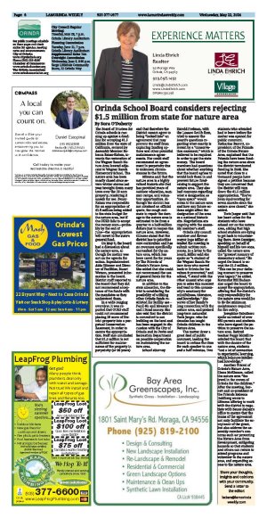 | Published May 22nd, 2024 | Orinda School Board considers rejecting $1.5 million from state for nature area | | By Sora O'Doherty | | | The Board of Trustees for Orinda schools is running up against a deadline for accepting $1.5 million from the state of California, secured by Assembly Member Rebecca Bauer-Kahan, towards the restoration of the Wagner Ranch Nature Area located adjacent to Wagner Ranch Elementary School. The nature area has been mostly closed since severe winter storms last year brought down many trees over the 19 acre property, rendering it unsafe for use. Bauer-Kahan was responsible for an appropriation of $1.5 million being added to the state budget for the nature area, but if the OUSD fails to accept the money soon-probably by the end of June-the appropriation will revert to the state's general fund.