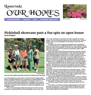 | Published May 22nd, 2024 | Pickleball showcase puts a fun spin on open house | | By Jon Kingdon |  | From left: Karen Reedy, Dana Reedy, Carmen Sanz, Melanie Snow, Chris Otani Photo Jon Kingdon | In a recent listing of an open house on April 30 at 3911 Happy Valley Road in Lafayette, Melanie Snow, an agent from Coldwell Banker, listed its seven bedrooms, six and a half baths, and luxurious view on 1.5 acres among its many other selling points. In addition, Snow made it clear prior to the showing that the owner, a pickleball enthusiast, had resurfaced the tennis court and lined it to make two pickleball courts available as well.
