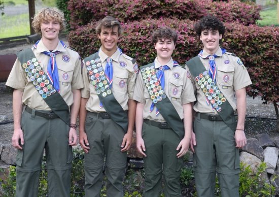 | | From Left: Stewart Cocotis, Danny Goldwyn, Cole Trimble, Rocco Fraioli Photo Missy Goldwyn | | | | | | Lafayette Boy Scout Troop 219 recently honored four young men who have achieved the Eagle Scout award, the highest rank in the Boy Scouts of America, on April 21, at Rolling Range Ranch. The scouts received recognition and proclamations from the City of Lafayette and Vice Mayor Wei-Tai Kwok, US Congressman Mark DeSaulnier, US Assemblywoman Rebecca Bauer-Khan, NASA, The Blue Angels, The White House, and The US Capitol.