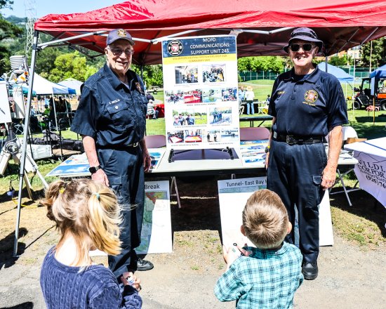 Tood Gritzer (right) and Ray Breslau (left) explain to some young fans how they help the fire department with communications and logistics when needed at the second annual Wildfire Prevention and Safety Fair at Orinda Community Park on June 1. Many residents came out to meet dozens of businesses and non-profit agencies and learn how to make themselves and their families safer, especially from fire.