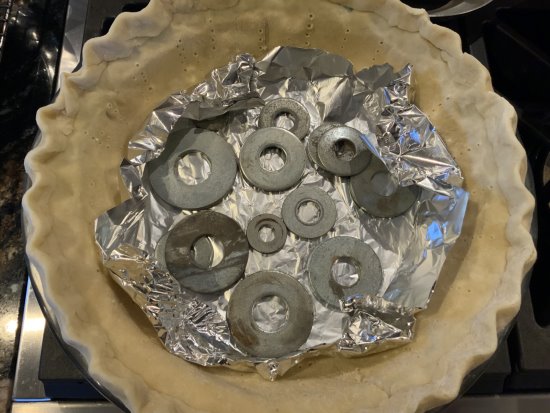 Also, be sure to poke lots of holes in the crust before laying the foil and weights over the raw crust. These help the air escape so big air pockets won't form in your pie shell. You can see that we were all out of pie weights and dried beans, so I went to my husband's tool shelf and got some nice heavy washers! They were magic!