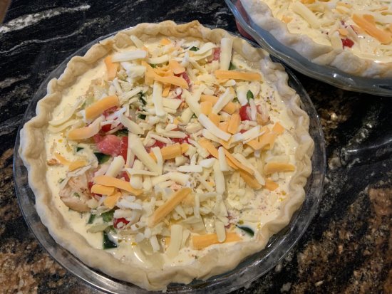 Layer the chicken, poblanos, jalapenos, onions, tomatoes, and the Pepper Jack cheese in the bottom of the pre-baked shell. Pour custard over the top and then sprinkle the mixed Mexican cheese over the top.
