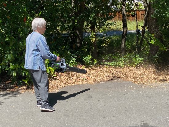 | Published June 19th, 2024 | First of July ban on gas leaf blowers powering e-device education push | | By David Scholz |  | Dorothy Walker uses a handheld e-leaf blower to clear leaves on the road across from her Lafayette home. She checked out the device from the City's Parks and Recreation Department through its leaf blower loaner program that is available to citizens to try out handheld and back-pack e-devices. Photo David Scholz | As residents prepare for the looming July 1 ban on gas powered leaf blowers in the City of Lafayette, an increasing number have been readying for the change by taking out electric models for test drives around their residences.