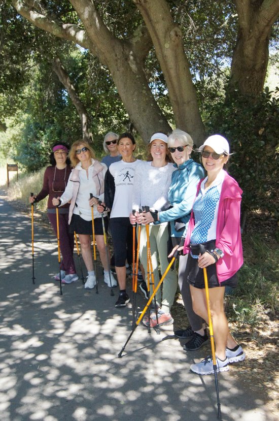 | Published June 19th, 2024 | Nordic walking gains popularity in Lamorinda | | By Elaine Borden Chandler |  | Parto Vossough, Regine Jarett, Patty Rippon, Helene Le Guinec, and Stephanie Schlegel, Surat Perez, and Mary Ann Walsh take a quick break from Nordic Walking at Lafayette Reservoir on May 28. Photo Elaine Borden Chandler | A new type of exercise has recently arrived in the Bay Area. At the Lafayette Reservoir, in Briones Regional Park, on the Iron Horse Trail, and in the suburbs of Moraga and Danville, there are people energetically walking with what looks like ski poles in their hands. "The thing about this sport is that not many people know about it," said an amused Surat Perez. "Whenever I go out for a walk with the poles people ask me, `Are you okay? Are you injured?'" This new sport is Nordic walking, where specialized poles and movements are used to exercise the whole body, with greater emphasis on the arms and core than regular walking.