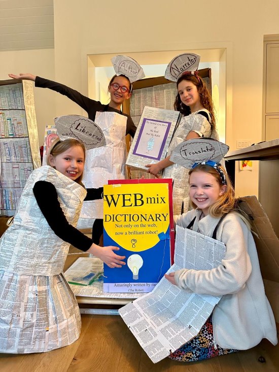 Their long-term project required them to write a short play for which they would design a robot that encounters three works of art, signals that they are not beautiful, then dismantles and recreates one into something it finds beautiful. The team chose to defend books as works of art, and made their costumes and entire set out of old book pages. Their robot looks like a dictionary, and as it moves across the stage its pages actually turn; the robot's pages define poetry as "incorrect," libraries as "useless," and novels as "wasteful." But the team adamantly defends the importance and beauty of books. In the end, the robot-dictionary inadvertently discovers that the pages of one book are made of mirrors, and it comes to see itself in the mirror-pages, realizing that both robots and books are works of art created by human creativity. The play is poignant, humorous, and most of all a huge celebration of books!