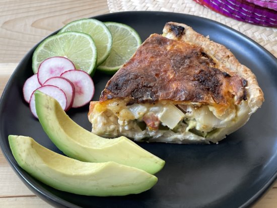Mexico meets France with this savory chicken quiche. It's made with tender shredded chicken, onions, tomatoes, poblano and jalapeno peppers, chili lime seasoning and grated cheese. The combination of flavors is so satisfying. Baked into a flaky, buttery crust, it's the quintessential comfort food! It's so delicious, and you can make it ahead and freeze it, so you have a quick meal for weekend guests or mid-week dinners! While I'm at, I often make two - one for now and one for later!