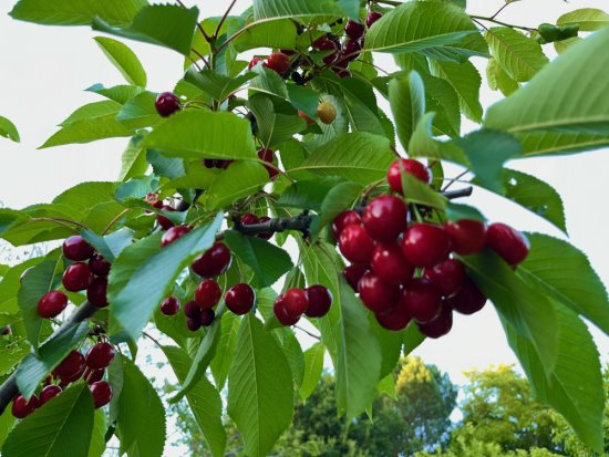 Because of a miniscule harvest last summer, I cut my trees back by a third. This June, my efforts were rewarded with a bounty of sweet cherries, even enough to share with the flying acrobats. Most people are familiar with Bing cherries sold in supermarkets. The deep red-purple black colored Bings are firm, juicy, and known for their rich sweet taste with a hint of tartness. Compared to the Bings, the mild, honeyed flavored, and lesser-known Queen Anne varieties are crunchier, marbled with bright red and yellow hues. Like the birds, I gobble them fresh from the branch. When I was a kid, our family always worked on neighboring farms picking cherries, which usually ripened in late May. The pay was minimal, but the perks included opportunities to eat these delectable fruits as we filled the buckets for sale. One year my siblings and I competed for who could pick the most cherries in the fashion of "one in my mouth, one in the bucket." Becoming painfully sick, we all paid the price of our childishness. For years, none of us could tolerate the sight of a single cherry.
