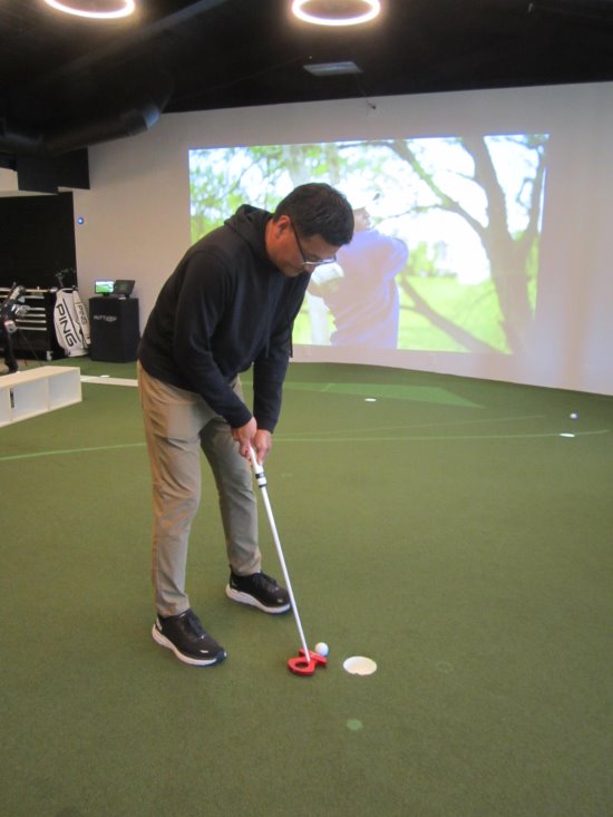 | | Sunday Swing's Edwin Lee on the "putting green" Photo Vera Kochan | | | | | | Golfing indoors? Yep, and it's now a reality in Moraga. Sunday Swing is an indoor golf performance center that boasts expert instructors and tour-level technology to help anyone improve their golfing skills.