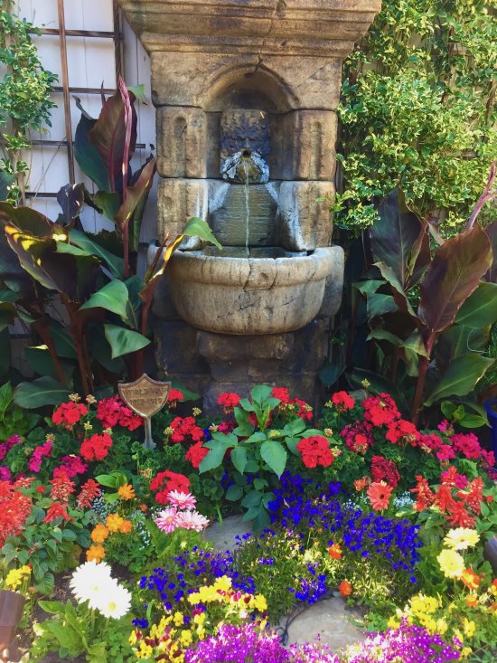 | A mixed border garden with a gurgling wall fountain.  |