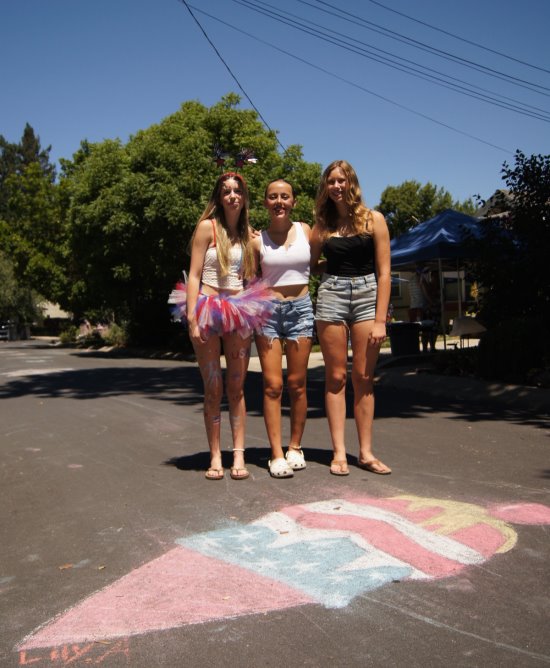 | Published July 17th, 2024 | Chalk drawings bring color to Saranap neighborhood | | By Elaine Borden Chandler |  | Annie Andres, Lily Andrews, and Leah Andres with one of their chalk drawings. Photo Elaine Borden Chandler | Amidst the Fourth of July traditions of grilling, fireworks, and parades, Saranap neighborhood has one that is beloved but unique. As two women at the Forma Gym informed their friends: "We're going to see the chalk drawings." At Annual Ponderosa Lane Fourth of July Celebration, the street was closed off and filled with people in themed outfits, American flags, and tables sitting in driveways waiting to be loaded with food. At the curve of the street, the pavement itself bloomed into color, covered by dozens of chalk drawings. The two artists behind this little local tradition are two teenage girls, Lily Andrew and Annie Andres.