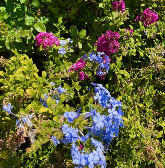 Sky blue plumbago with pink crape myrtle. Photo Cynthia Brian |