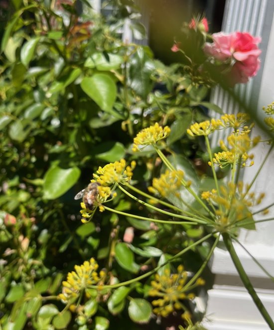 Bees are gathered on my bronze fennel. I cut a few fronds of seeds to sprinkle on my vegetables for tonight's meal without bothering the buzzers. Walking my property, I noticed that my many hollyhocks were being eaten by the painted lady butterfly caterpillars. Painted lady butterflies are found throughout the world and because they are such beneficial and beautiful pollinators, I am happy that they dine on my hollyhocks.