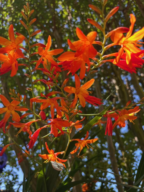 Hummingbirds, bees, and butterflies are darting about, oblivious to my presence. The fiery orange crocosmia, also known as coppertips or firecracker plant, is on display and attracting pollinators. I adore this exotic perennial because the corms are easily transplantable, it blooms when so many other plants are dormant, and it is showy in floral arrangements. Although it is a sun lover, I've also planted it in sheltered shade for longer-lasting blooms.