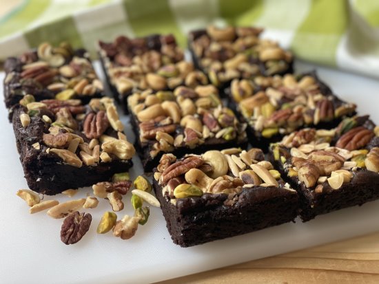 If you don't like nuts, no worries, just don't use them, and if you love nuts, you can always add more chopped nuts to the batter. We love this combination of pistachios, almonds, walnuts, pecans, and cashews because it looks and tastes so great, but we also love our brownies with just toasted pecans on top, too. Whichever combination of nuts you pick; just remember they are always better when pre-toasted in a 350 F oven for about 5-7 minutes.