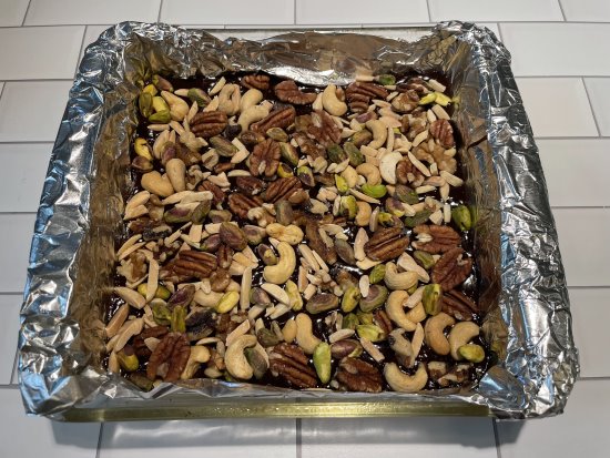 Spread the batter into the prepared pan and cover with the toasted nuts. Gently press the mixed nuts ever so slightly into the batter with your fingers or a spatula. Bake in 350F oven for 25-30 minutes. Even if they are still soft, remove from oven as they will continue to cook from the heat of the pan. Cool completely before cutting into 2-inch squares. Store them in an airtight container in the refrigerator. |