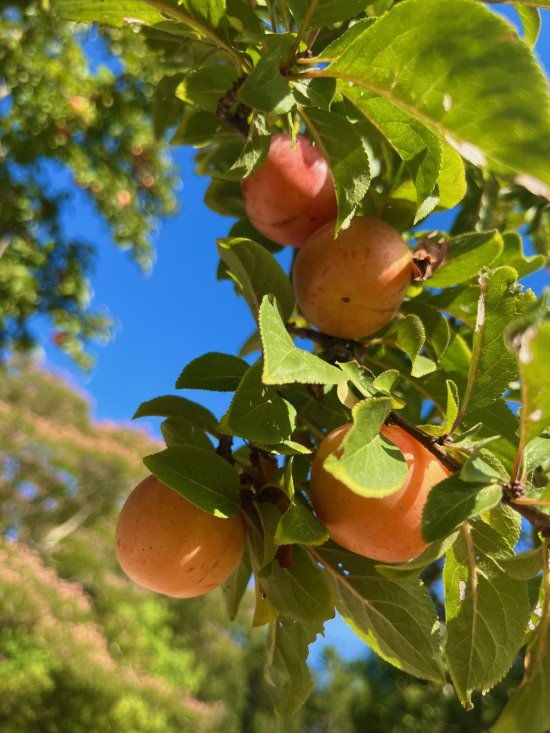 Originally a cherry plum tree, the plums this year are large, orange, and apricot flavored. Photo Cynthia Brian |