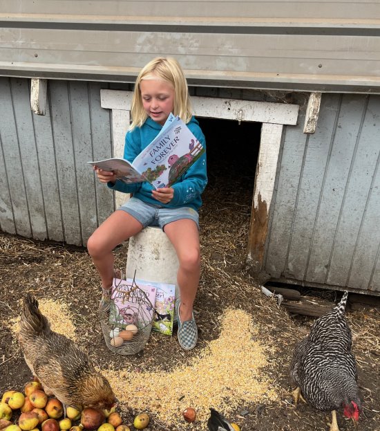 Cynthia's granddaughter reads to the chickens after collecting