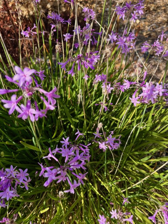 Society Garlic: Many people aren't aware that the deer-resistant flowers and leaves of society garlic are edible. I use them as garnish on baked potatoes as well as in sandwiches.