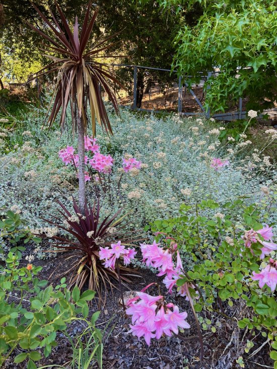 Care: Once established, Naked ladies require minimal care. They are drought-tolerant and don't require regular fertilization. In colder climates, mulch is suggested to be scattered around the base to protect the bulbs from freezing temperatures. The "minimal care" may be a bit of a misnomer when multitudes of Naked ladies are in the garden. The dried winter leaves must be pruned in spring and the dead stalks must be cut to the ground after blossoms fade. These tasks are easy to do, yet very time-consuming.