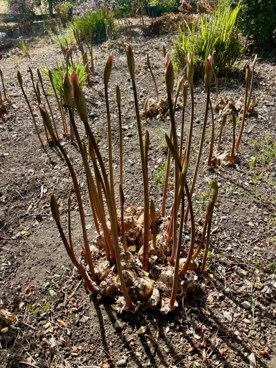 Amaryllis belladonna is the botanical name of the flower, "Naked lady". Belladonna means "beautiful lady" in Italian. These plants are called Naked Ladies because of their unique bloom pattern. In the winter, the bulbs produce a bounty of beautiful, shiny green leaves like the leaves of agapanthus. Those leaves wither and die in spring around the same time that the strappy leaves of daffodils are browning. With so many bulbs, it takes me awhile to remove and compost the dead leaves. With the leaves gone, dirt-colored bulbs resemble rough turtle shells as their rounded heads form clusters. In August, single stems sprout from the ground. Finally, flowers emerge at the top of the stems giving them a striking appearance as if they're "naked" because they are standing alone without leaves.