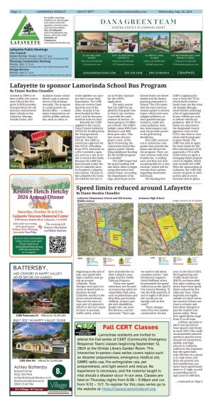 | Published August 28th, 2024 | Lafayette to sponsor Lamorinda School Bus Program | | By Elaine Borden Chandler | | | Created in 1994 to reduce traffic, the Lamorinda School Bus Program (LSBP) provides transportation for elementary and intermediate schools in the Lafayette, Moraga, Orinda Union, and Acalanes Union school district and at present serves 1100 students annually. The program is a joint powers authority (JPA) - a stand-alone organization created by public authorities, such as cities, to work together on a project that crosses their boundaries. The LSBP does not receive funding from any of the cities. Instead, it has been funded by Measure J and by bus pass revenue since its start.